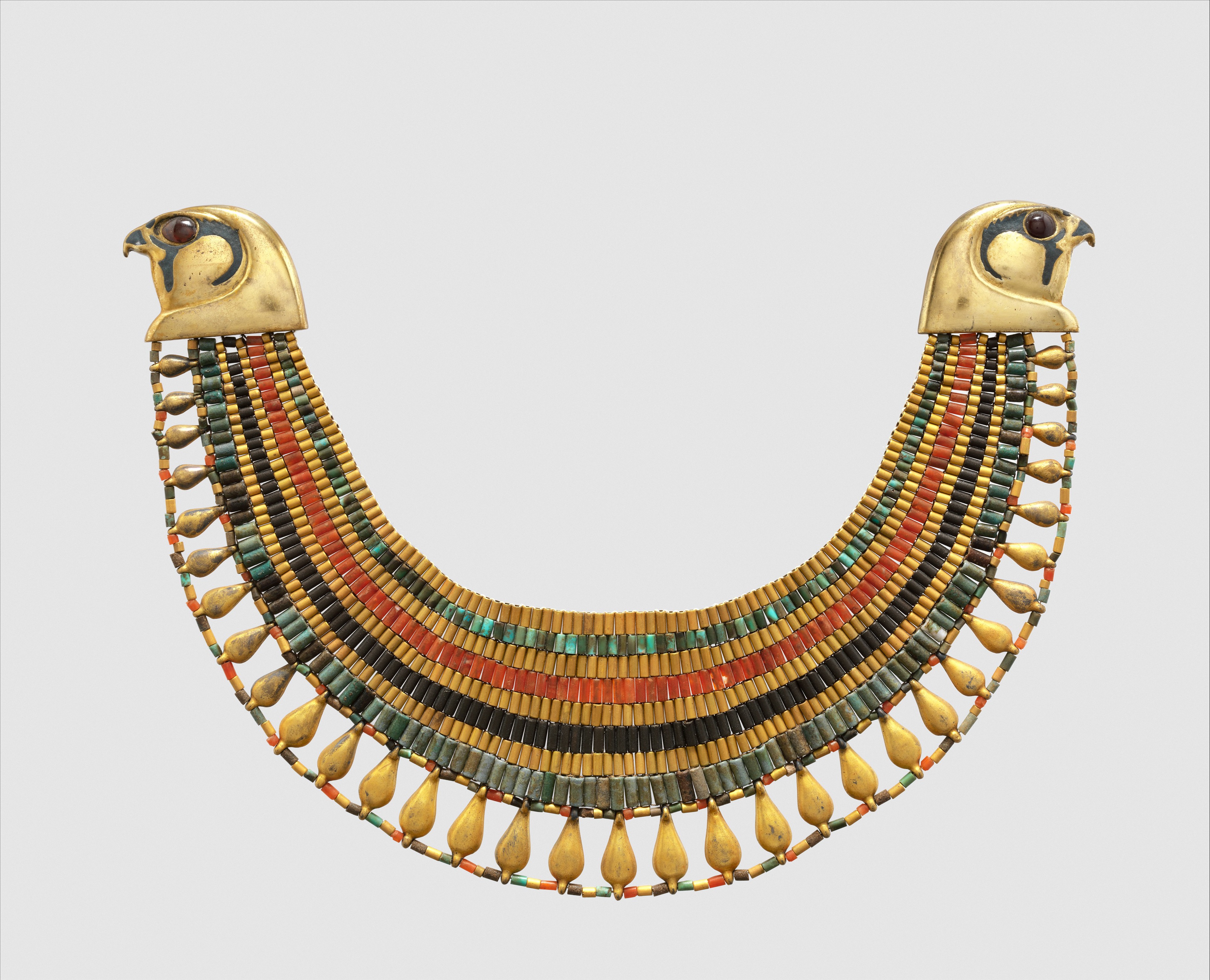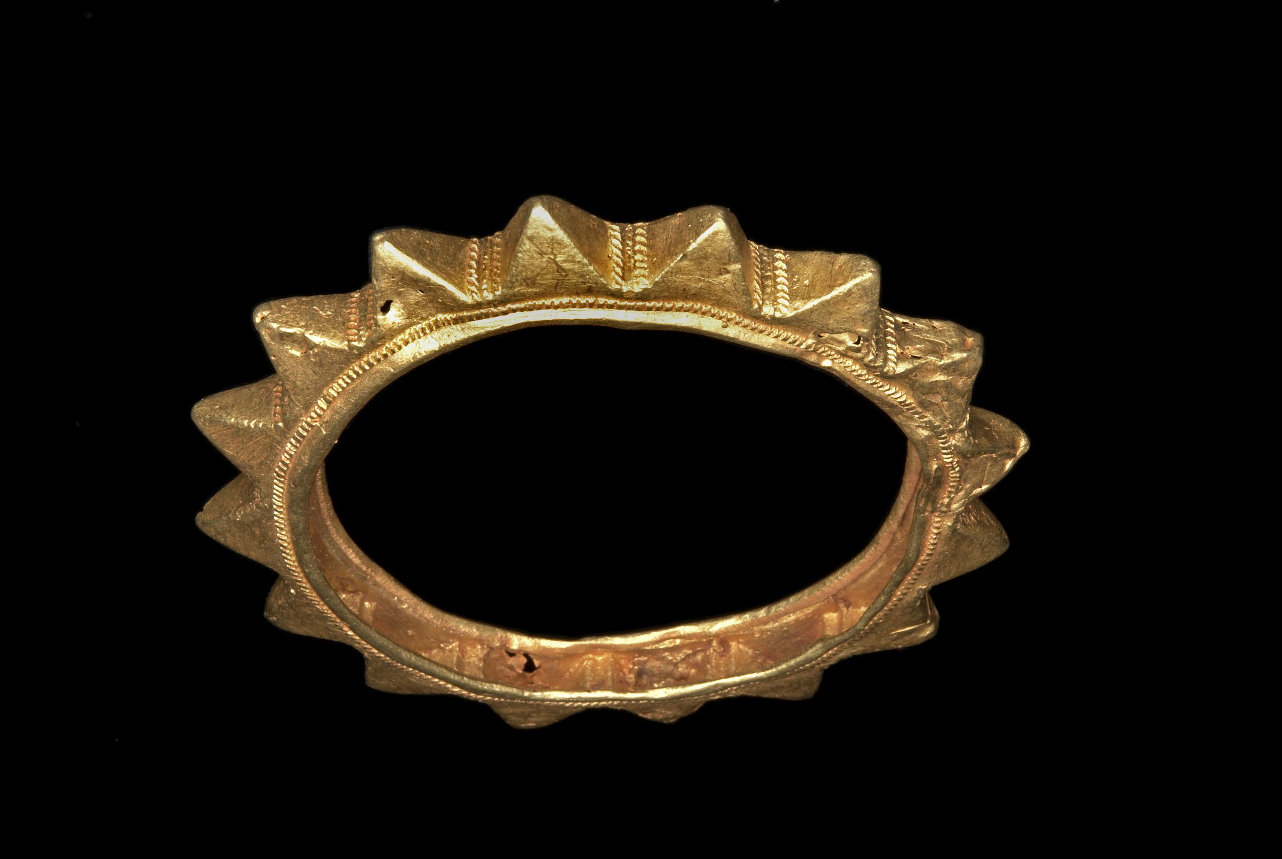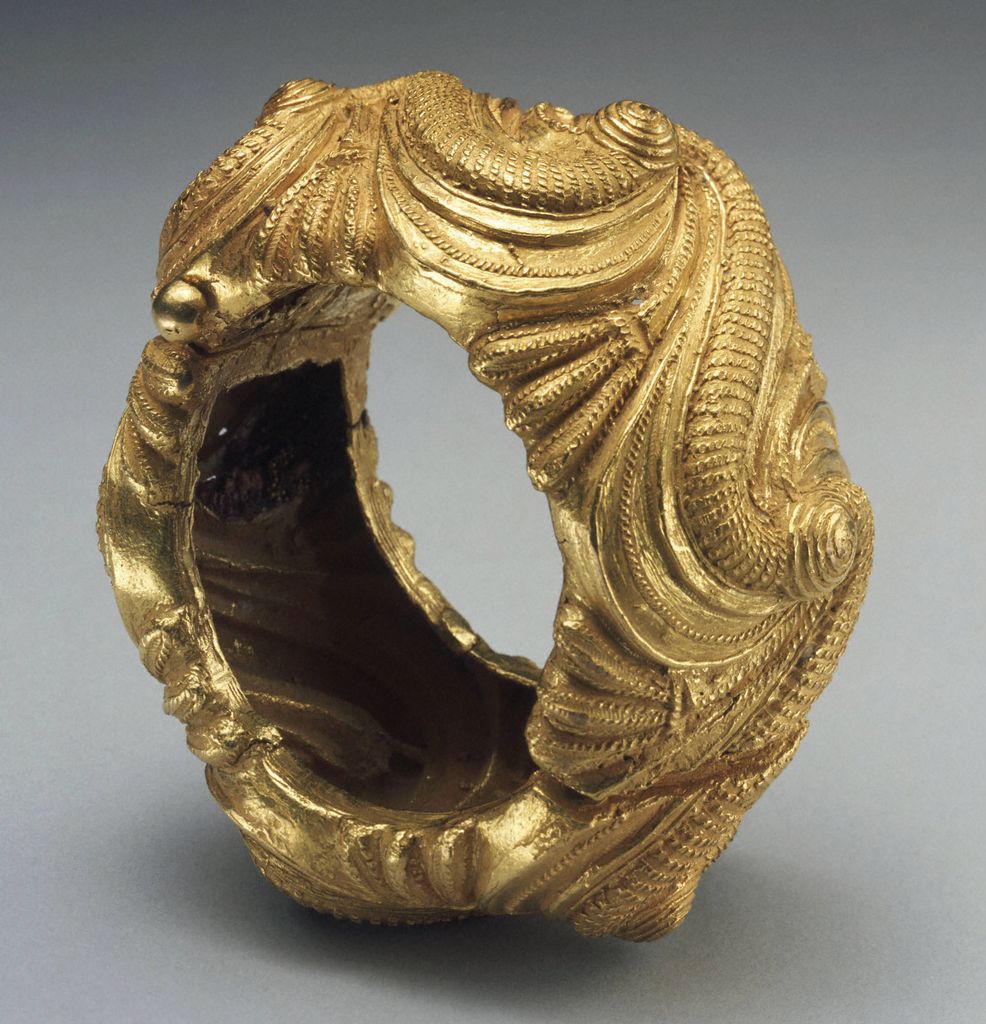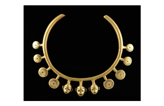 Torque Collier de chasseur de têtes constitué d'un torque en bronze orné de huit pendentifs gravés d'une spirale et de trois têtes trophées.